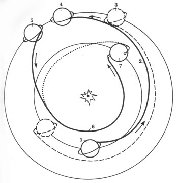 ![]() Схвма проведения марсианской экспедиции: 1 — старт ТГК и постепенное раскручивание по спирали на орбите ИСЗ в целях перехода на траекторию полета к Марсу; 2 — межпланетный полет ТГК в течение 370 сут; 3 — полет КК и прибытие его к Марсу через 150 сут после старта; 4 — выход на орбиту ИСМ пилотируемого корабля; 5 — пребывание экипажа на поверхности Марса (30-60 сут), старт с орбиты ИСМ для возвращения на Землю; 6 — межпланетный полет КК длительностью около 257 сут; 7 — выход КК на орбиту ИСЗ и карантин экипажа, посадка на Землю |