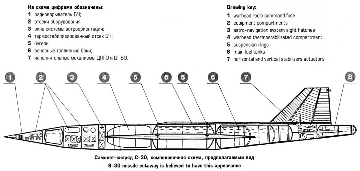 Компоновка снаряда С-30 базировалась на проекте 2РС и сохранила его крыло, оперение и силовую установку из двух ПВРД